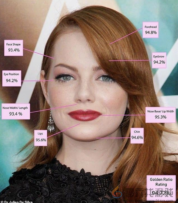 据他介绍,艾玛·斯通能够成为绝对领先者,是因为她所有面部特征都精准契合经典美学比例。